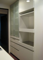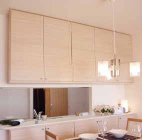キッチンなどでよく使われる、天井や壁に取付けられる扉付き棚。